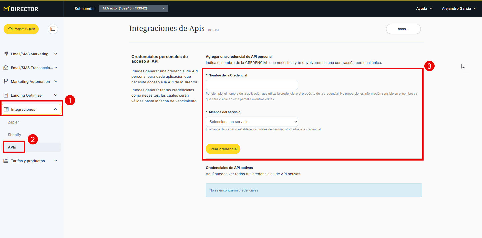 - Debes tener creada la API correspondiente a la subcuenta con la que quieras conectar. Para ello debes ir al apartado "Integraciones" en tu cuenta MDirector y dentro de la sección "APIS" generar un API de servicio de Email correspondiente a la subcuenta que quieres utilizar (recuerda guardar la contraseña de la credencial del API ya que solo se permite visualizar una única vez):