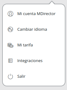 1- Al entrar en su cuenta de MDirector acceda a el apartado "Integraciones" haciendo clic arriba a la derecha en su nombre: