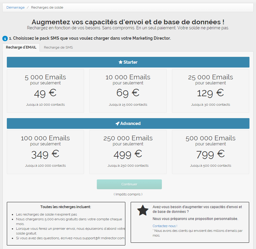 Vous pourrez accéder à la zone de Recharges d'Email de la façon suivante.