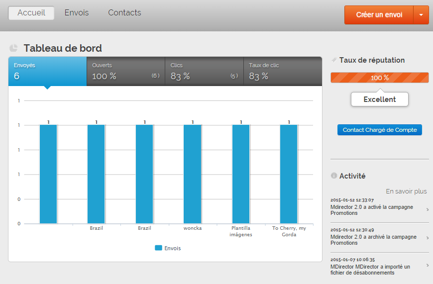 - Dans le Tableau de bord, de l’information sur vos derniers envois est montré dans un graphique à barres facile à lire, plus les données correspondant au numéro total d’envoyés et les pourcentages généraux d’ouvertures, clics et CTR.