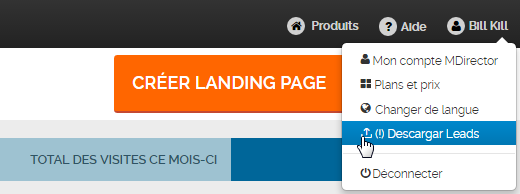 Pour télécharger tous les leads des tous les landings, vous pouvez le faire en cliquant sur "Télécharger leads" que vous pouvez trouver dans le menu à droite sur le nom de votre utilisateur.