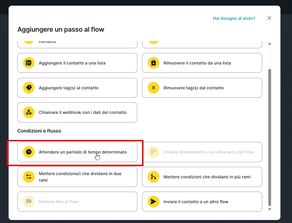 Ogni volta che un contatto raggiunge questo passaggio, si fermerà per il periodo di tempo configurato prima di proseguire con il passaggio successivo del flow.