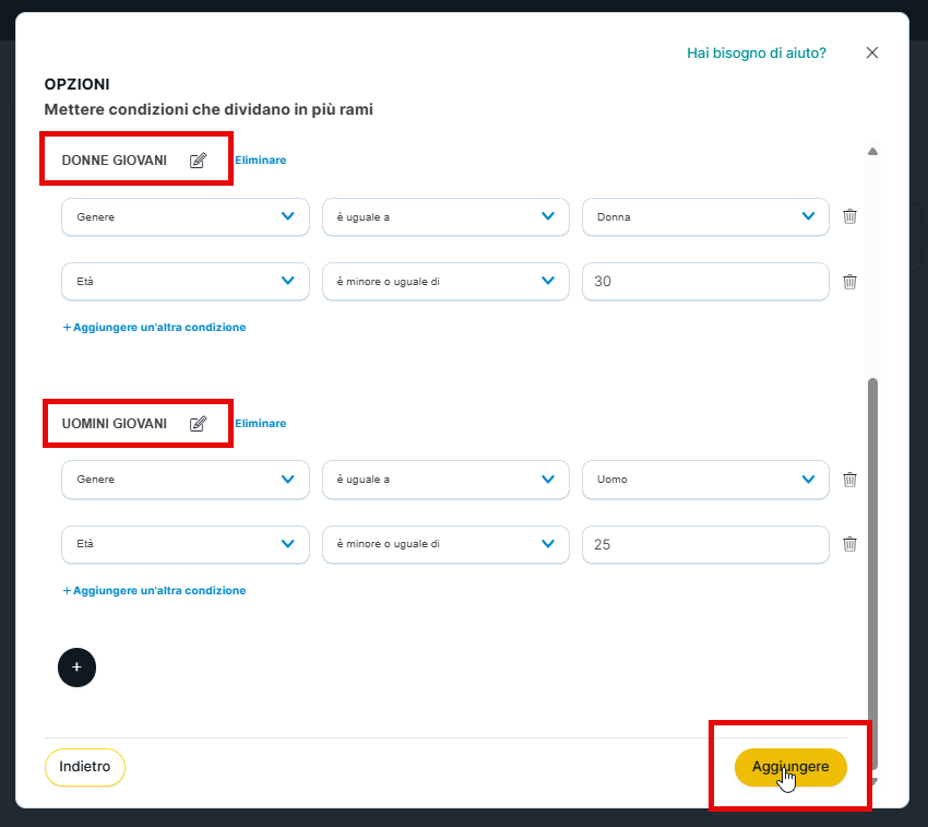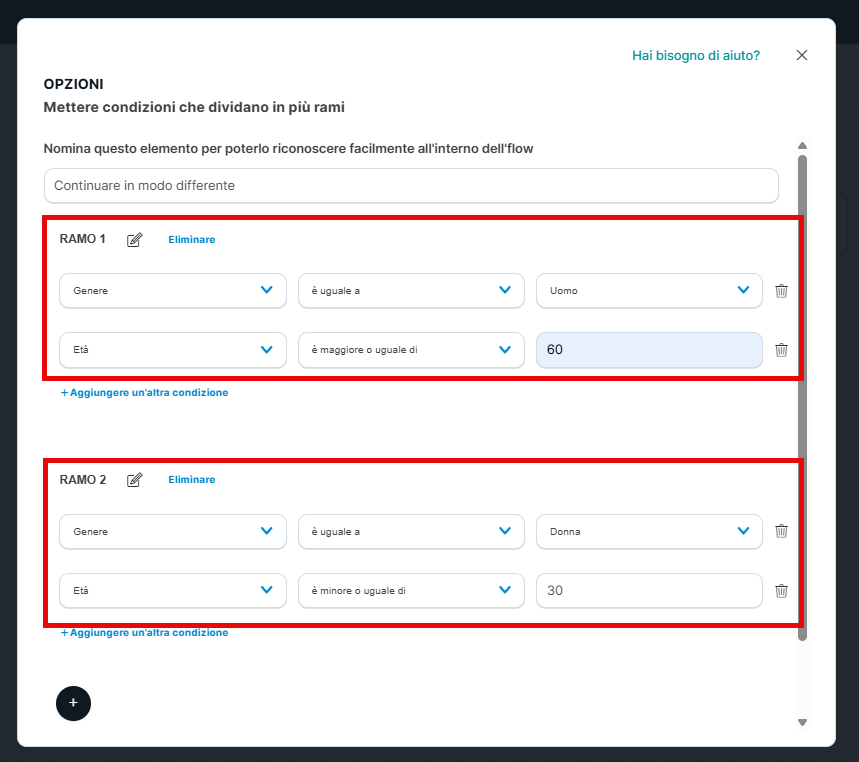 Se lo desideri, puoi aggiungere più condizioni a uno stesso ramo tramite il pulsante “+Aggiungere un’altra condizione”. Una volta configurato, puoi creare un nuovo ramo cliccando sul pulsante “+” e ripetere lo stesso processo per definirne le condizioni.