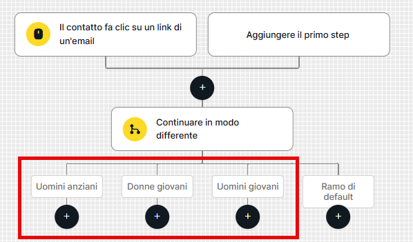 Noterai che ora il ramo del flusso su cui stavi lavorando è stato diviso in più rami nuovi con i nomi definiti. Ogni contatto seguirà il flusso attraverso il/i ramo/i le cui condizioni sono soddisfatte.
