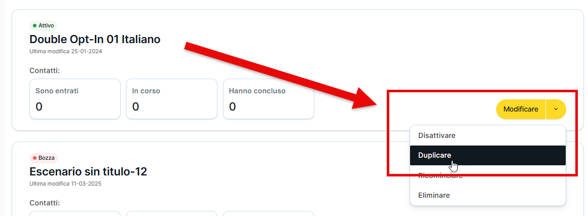 Per duplicare un flow, dobbiamo farlo dalla lista. Prima, individuiamo la scheda del flow desiderato e clicchiamo sulla freccia a destra del pulsante "Modifica", che apre il menu delle azioni. Successivamente, selezioniamo l'opzione "Duplicare".