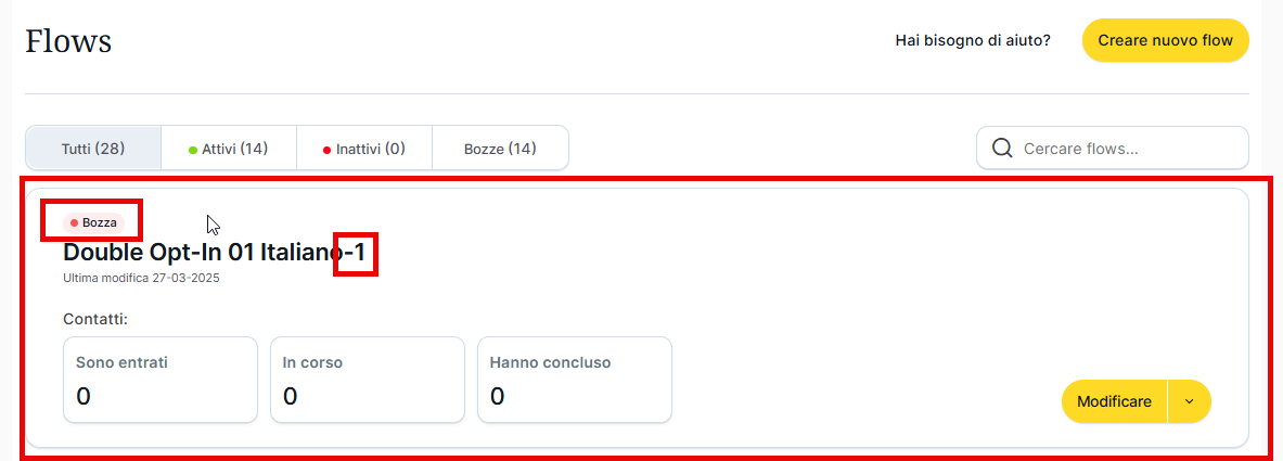 Noteremo che il nuovo flow è stato creato nella lista in stato di bozza, con lo stesso nome seguito da "-1".