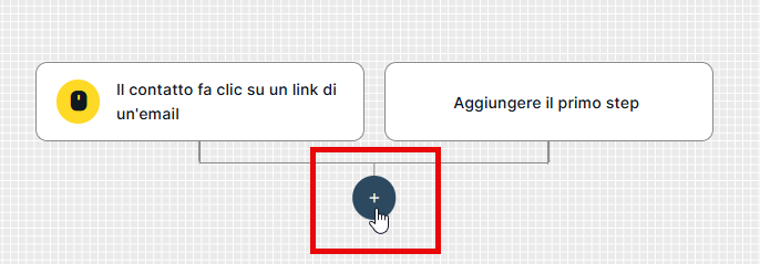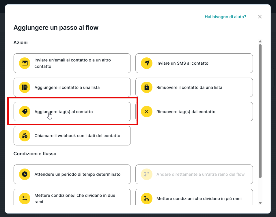 Se vogliamo aggiungere un passo che assegni uno o più tag ai contatti che raggiungono un nodo specifico —dopo averne superati altri in precedenza— la prima cosa da fare è cliccare sul pulsante “+” e selezionare l’opzione “Aggiungi tag al contatto” all’interno della categoria “Azioni”.