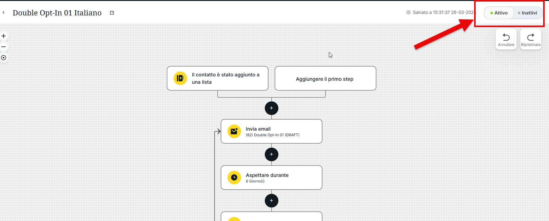 Se siamo già nella pagina di modifica del flow, vedremo un interruttore con i due stati disponibili: "Attivo" e "Inattivo". Per disattivare il flow, basta cliccare su questo interruttore.