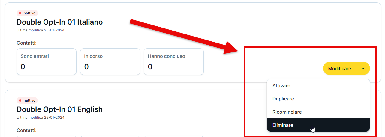 Se vogliamo eliminare definitivamente un flow, questa azione può essere eseguita solo dall’elenco. Per farlo, individuiamo la card corrispondente, clicchiamo sulla freccia che apre il menu delle azioni (accanto al pulsante "Modificare") e selezioniamo "Eliminare".