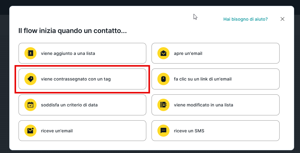 Se vogliamo che l'evento che avvia un flow di Marketing Automation sia l'assegnazione di un tag a un contatto, dobbiamo selezionare il punto d'ingresso "viene contrassegnato con un tag".