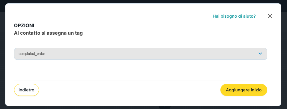 Si aprirà una finestra con un selettore che mostra tutti i tag creati nella sottocuenta. Selezioniamo il tag che vogliamo usare come trigger per far entrare il contatto nel flow.