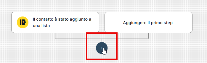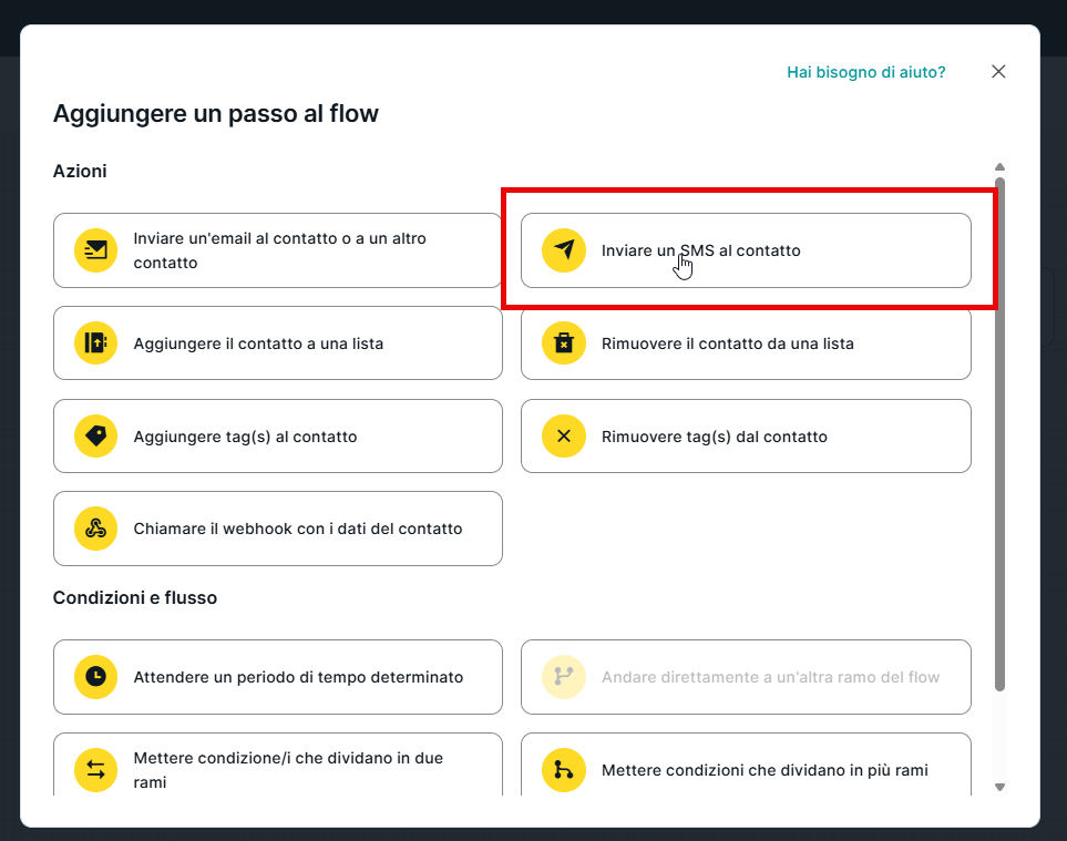 Per aggiungere il passaggio al flow, fai clic sul pulsante “+” e seleziona l'opzione "invia un SMS al contatto" dalla categoria delle azioni.