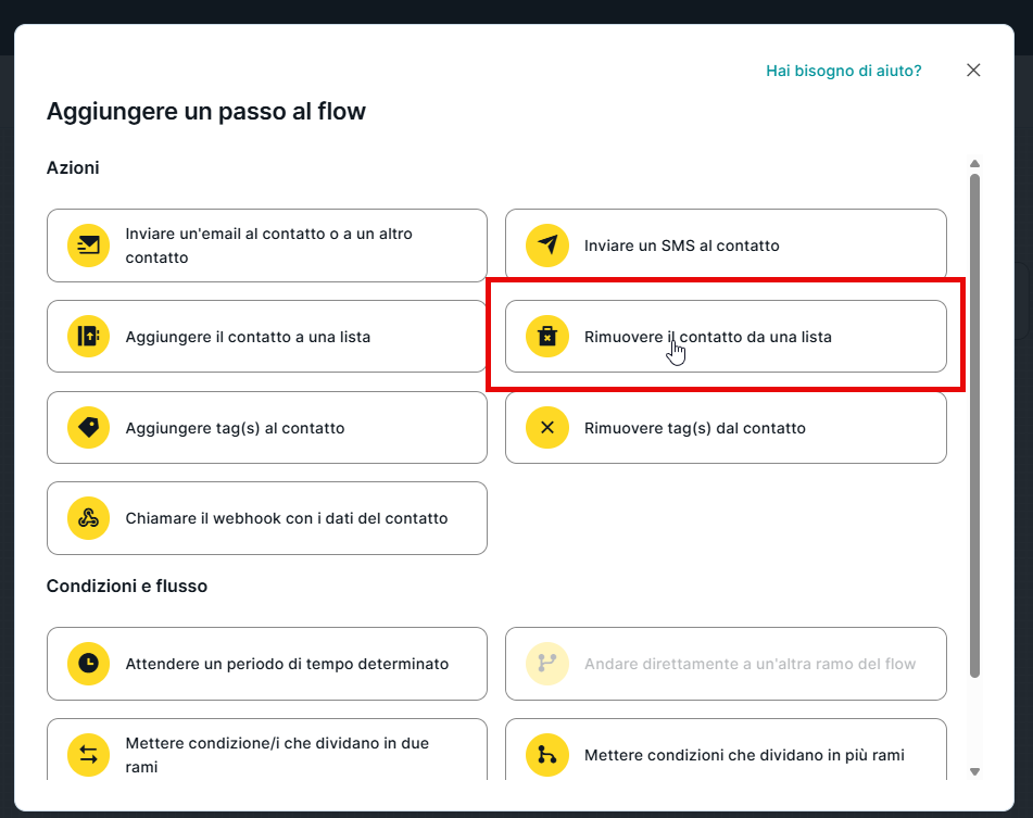 Se vogliamo aggiungere un passaggio che rimuove un contatto da una lista, la prima cosa da fare è cliccare sul pulsante "+" e selezionare l'opzione "Rimuovere il contatto da una lista" all'interno della categoria "Azioni".