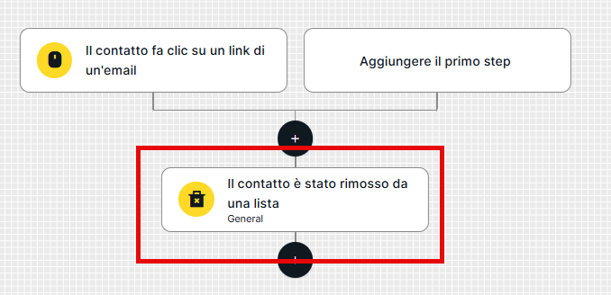 Noterai che il passaggio è stato aggiunto al flow. Ogni volta che un contatto arriva a questo nodo, verrà rimosso dalla lista specificata. Se vuoi che venga rimosso da più di una lista, dovrai creare passaggi aggiuntivi.