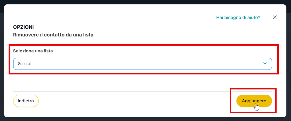 Successivamente, selezioniamo la lista da cui vogliamo rimuovere il contatto e clicchiamo sul pulsante giallo "Aggiungere".