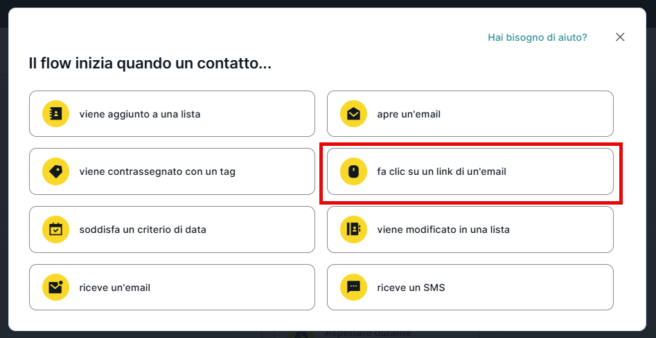Il punto d'ingresso descritto come "Il flow inizia quando un contatto fa clic su un link di un'email" avvia il flow quando un contatto clicca su un link specifico in un'email o su uno qualsiasi dei link presenti nell'email.