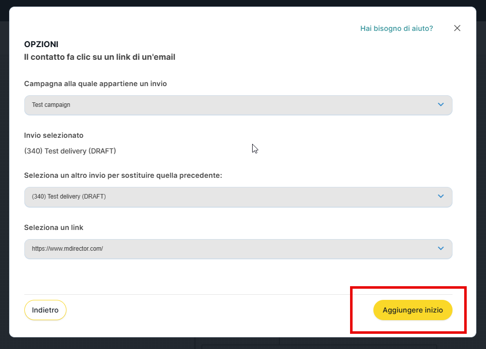 Una volta selezionato questo come punto di ingresso —o uno dei punti di ingresso— per includere un contatto nel flow, bisogna identificare il link o i link da considerare. A tal fine, si indica prima la campagna a cui appartiene l'invio dell'email, poi l'invio stesso e, infine, lo specifico link della creatività, se si vuole selezionarne uno in particolare. Se va bene qualsiasi link dell'invio, si seleziona l'opzione "qualsiasi link".