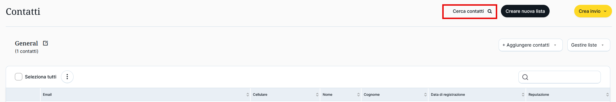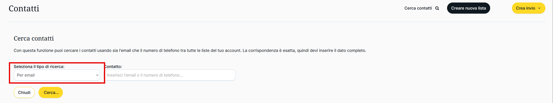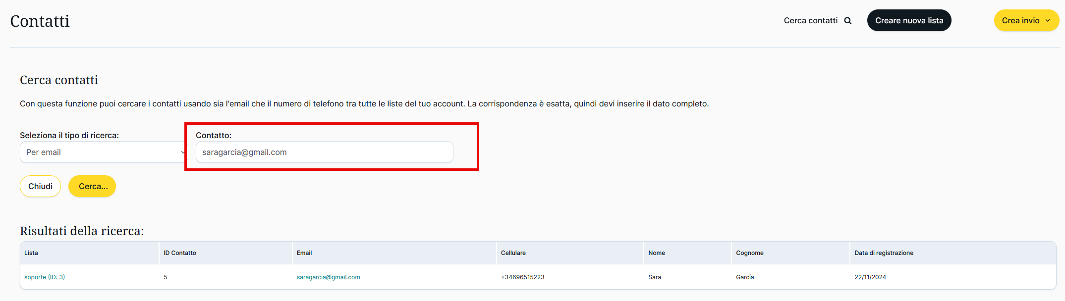 Questo strumento consente di individuare contatti tra tutte le liste dei contatti dell'account utilizzando l'email o il numero di telefono del contatto che si desidera trovare. La corrispondenza avviene in modo esatto, quindi è necessario inserire i dati completi.