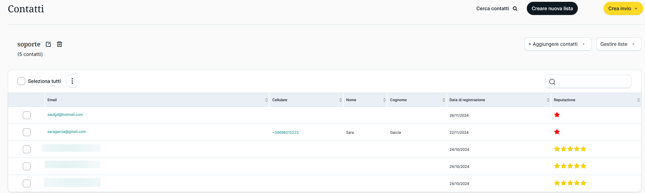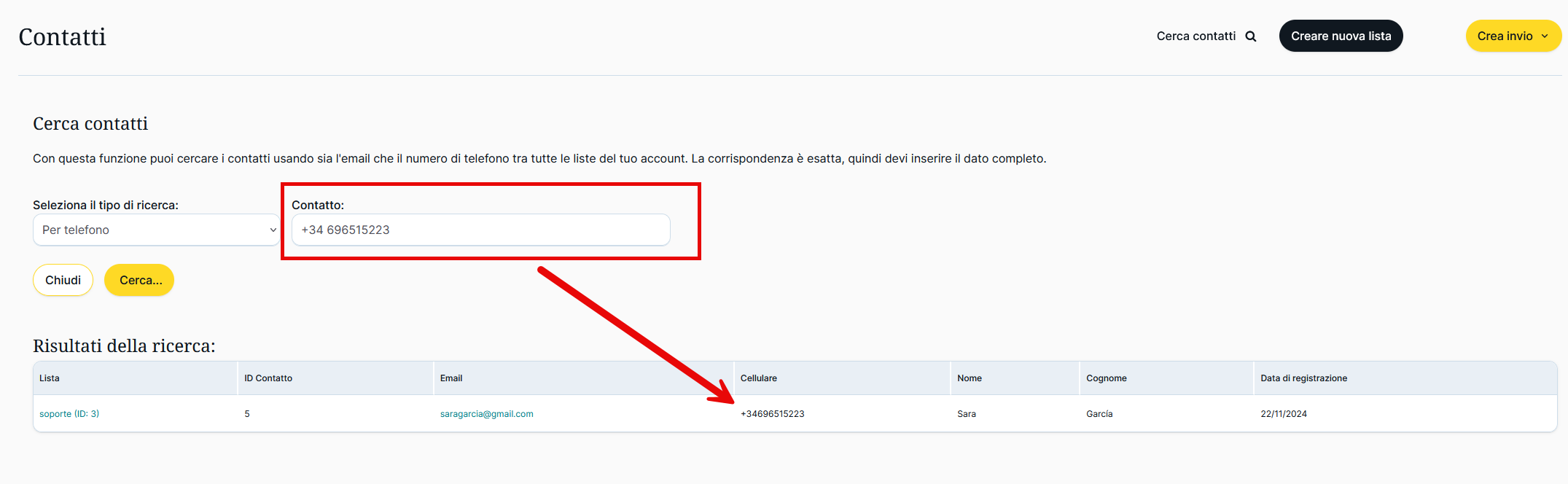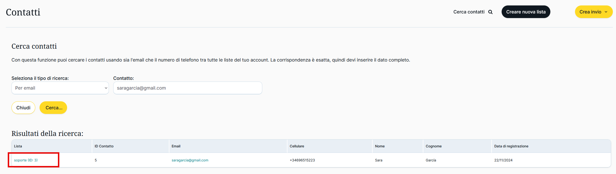 Come si può vedere nell'immagine, lo strumento di ricerca mostra tutte le liste in cui è stato importato il contatto.