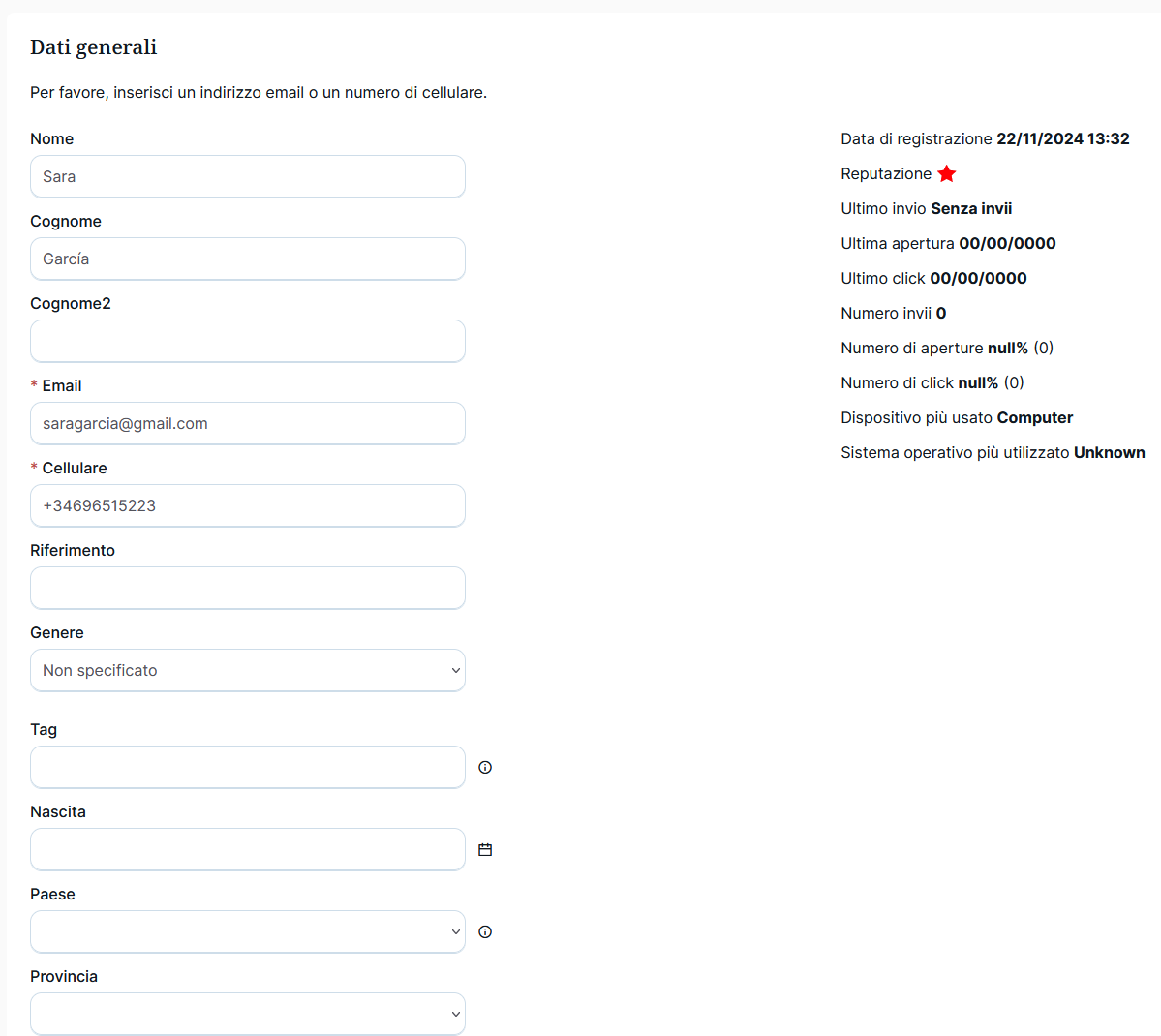 Se si fa clic sull'email, si apre una finestra modale che consente di modificare i dati del contatto: