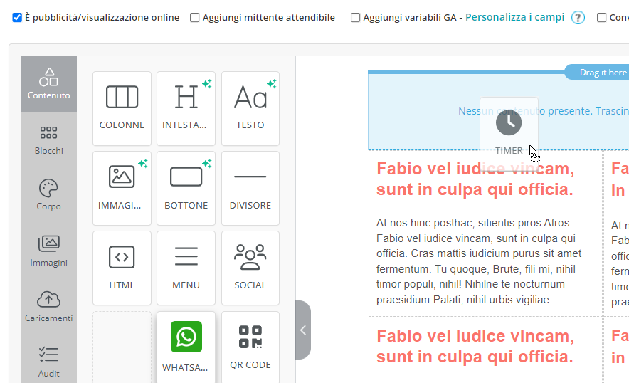 Il Nuovo Editor Migliorato di MDirector offre la possibilità di incorporare un timer, o, in altre parole, un conto alla rovescia, nella creatività di una campagna di Email Marketing. Per posizionarlo, basta trascinarlo dal pannello 'Contenuto' al blocco in cui si desidera aggiungerlo.