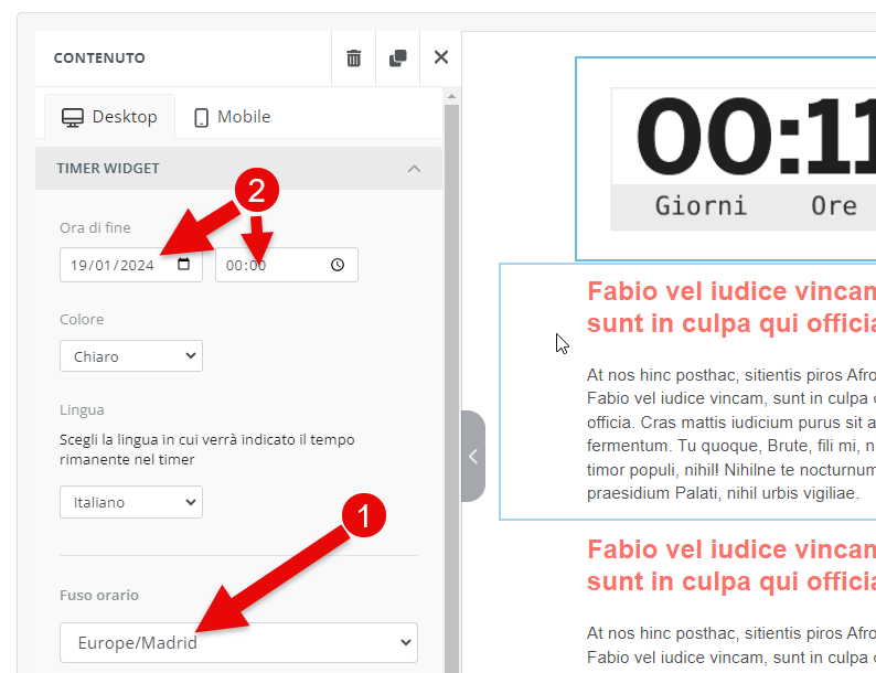 Nel menu corrispondente a questo widget, dobbiamo prima selezionare il fuso orario a cui farà riferimento questo conto alla rovescia e, in secondo luogo, la data e l'ora dell'evento.