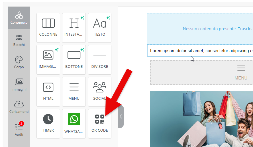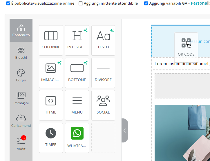 Il Nuovo Editor Potenziato di MDirector offre la possibilità di incorporare un codice QR nella creatività delle campagne di Email Marketing. Per inserirlo, trascinalo semplicemente dal pannello "Contenuto" al blocco in cui desideri aggiungerlo.