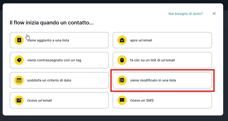 Se vogliamo che l'evento che avvia un flow di Marketing Automation in MDirector sia la modifica di un contatto in una lista (lingua, cambio di piano, dati di contatto, ecc.), dobbiamo selezionare il punto d'ingresso "modificato in una lista".