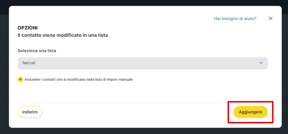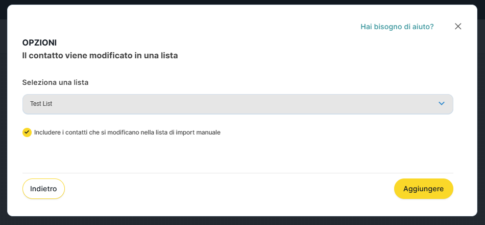 Qui selezioniamo la lista i cui cambiamenti attiveranno il flow. Se desideriamo includere contatti che vengono modificati tramite un'importazione massiva nella lista, basta selezionare l'opzione corrispondente.