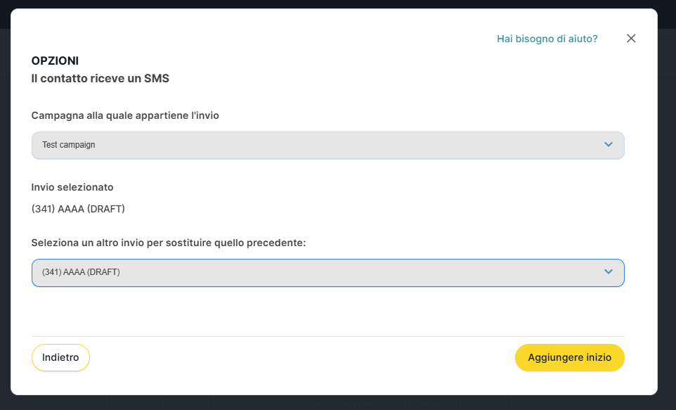 Qui selezioneremo l'invio precedentemente creato nella sezione "SMS Marketing" e la campagna a cui appartiene.