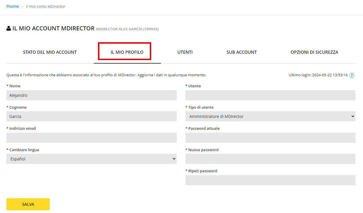 A differenza delle altre schede di "Il mio account MDirector", visibili solo agli amministratori dell'account, questa è sempre visibile per l'utente che ha effettuato l'accesso, poiché contiene i dati associati allo stesso.