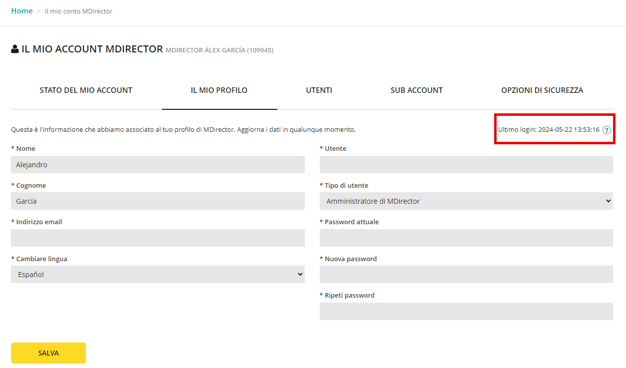 Da qui puoi anche visualizzare la data e l'ora dell'ultimo accesso in alto a destra, proprio sotto il menu a schede di "Il mio account MDirector".