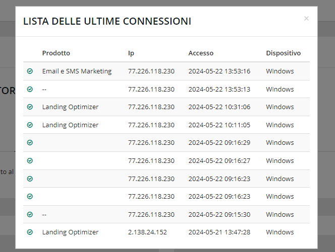 Se premi il tooltip (l'icona di interrogazione) accanto a questi campi, si aprirà una finestra modale con gli ultimi 10 accessi all'account, gli indirizzi IP e i dispositivi da cui sono stati effettuati, così come il servizio a cui si è acceduto.