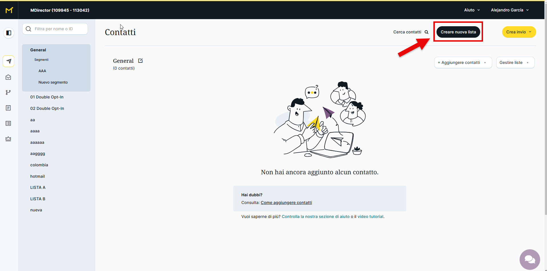 I contatti sono organizzati in liste create secondo i criteri che scegli, e sono in queste liste che avviene l'importazione. Dal momento in cui viene creata un'account su MDirector, esiste una lista iniziale chiamata "General", che non può essere eliminata, ma può essere rinominata. Puoi utilizzare quella stessa lista per iniziare a importare i contatti, ma se desideri creare una lista diversa in cui aggiungerli, segui questi passaggi: