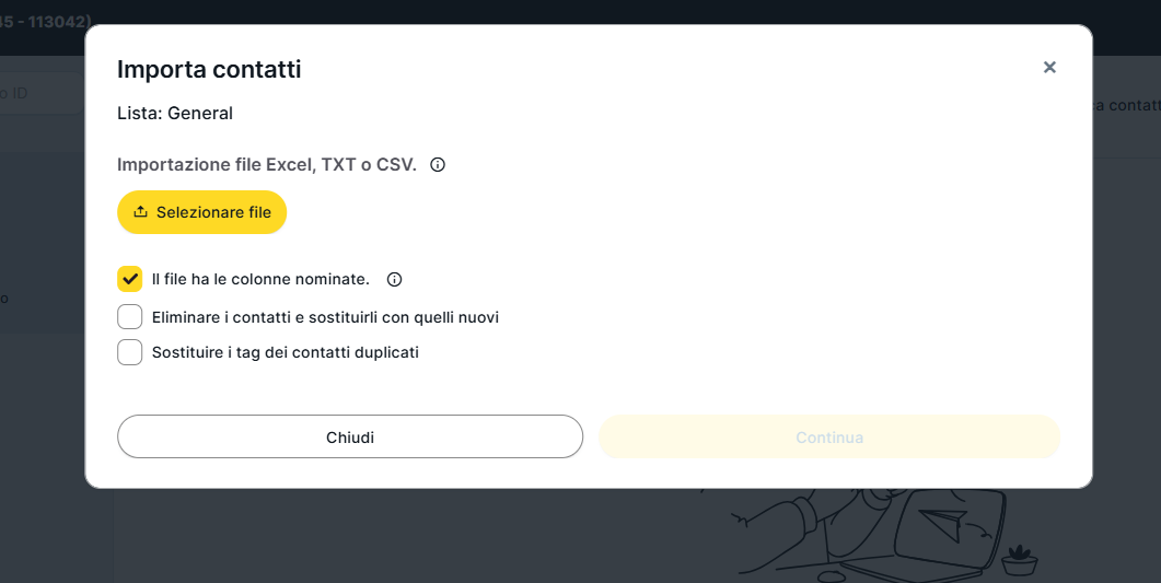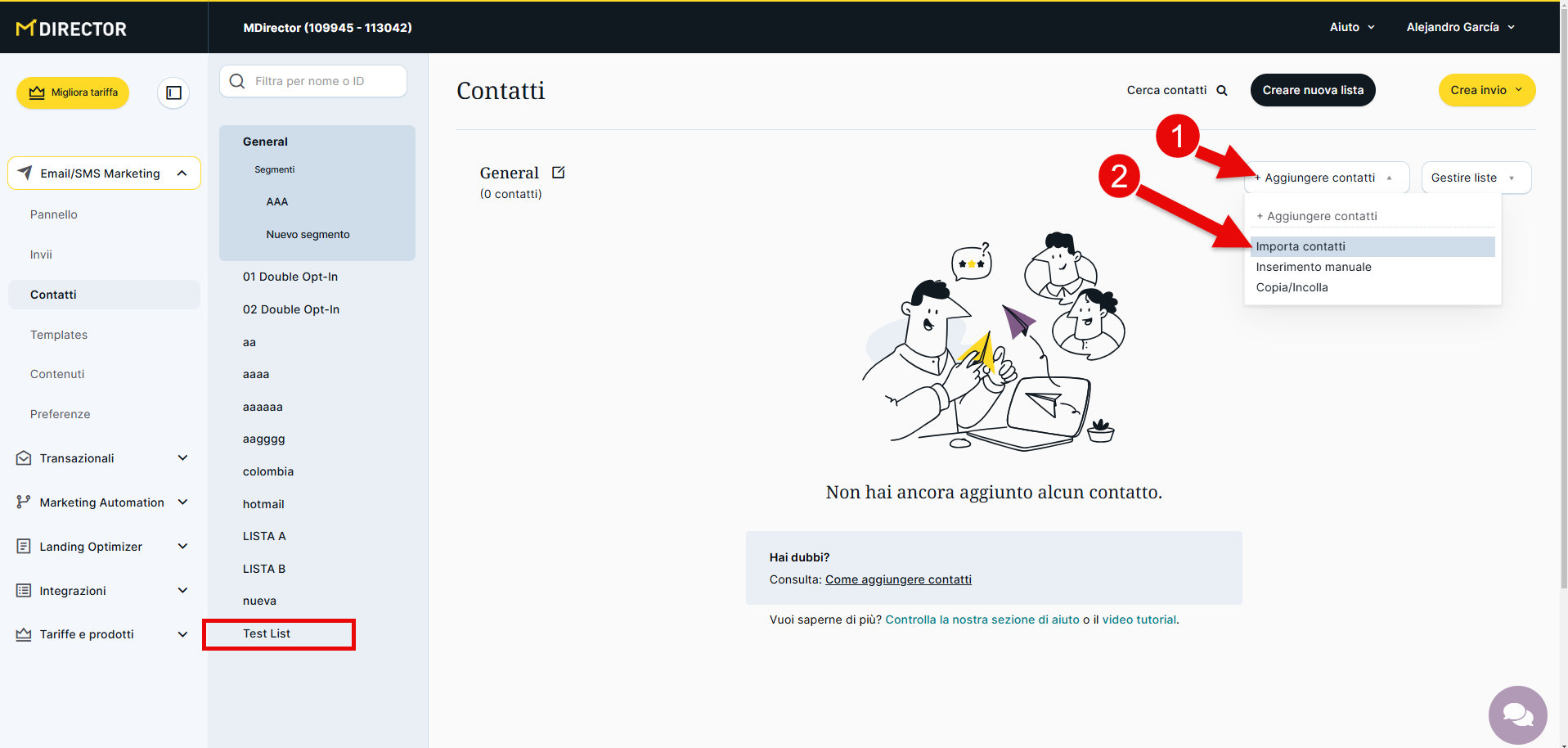 Prima di importare i contatti tramite file, devi creare una lista di contatti o accedere alla lista "General". Se non l'hai ancora fatto e non sai come farlo, visita questo articolo: https://mdirector.zendesk.com/hc/it/articles/6693916588946-Gestione-Delle-Liste-Dei-Contatti