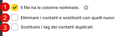 Il primo, "Il file ha le colonne nominate", serve per indicare se i campi, siano essi standard o personalizzati, sono indicati nella prima riga del file, come nel esempio visto prima. Questo è altamente raccomandato. Se vuoi aggiungere campi personalizzati, in questo articolo ti spieghiamo come farlo: https://mdirector.zendesk.com/hc/it/articles/201944212-Come-si-creano-i-campi-personalizzati