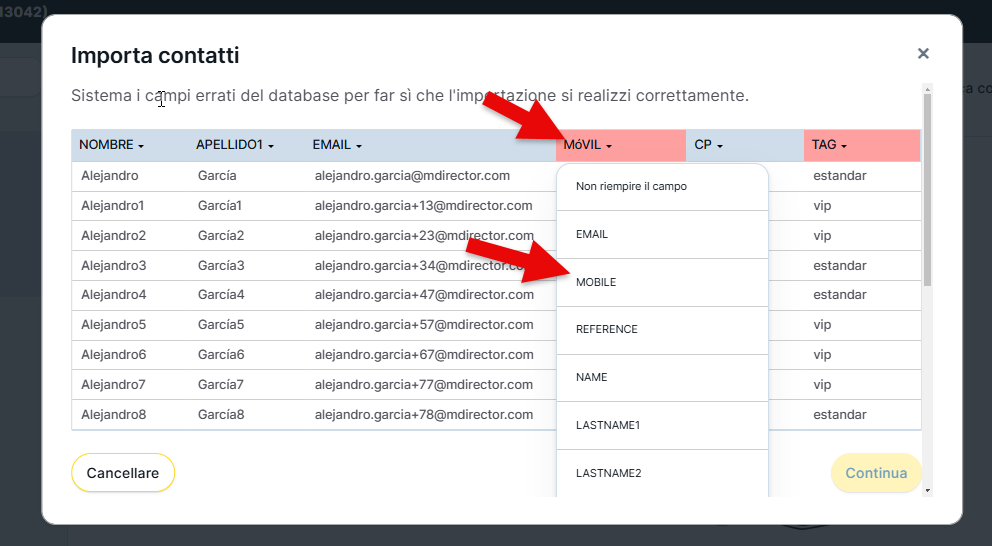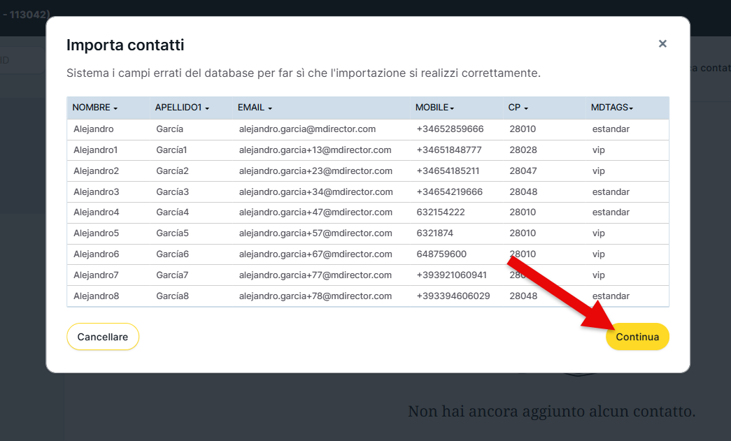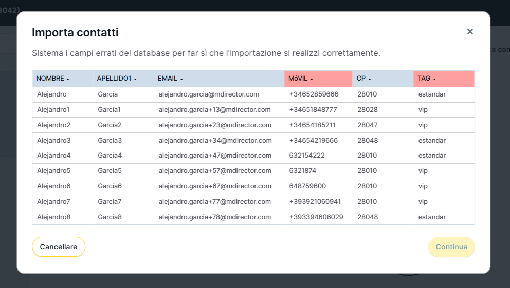 * Rivedere il formato dei numeri di telefono cellulare qui https://mdirector.zendesk.com/hc/it/articles/9228068918556-Come-importare-i-contatti-con-il-numero-di-cellulare e i valori o i formati accettati per i campi data, paese, provincia e sesso in questo articolo https://mdirector.zendesk.com/hc/it/articles/204780612-Tavola-dei-codici-Paese-Provincia-Genere-e-Data per preparare il file dei contatti per l'importazione.
