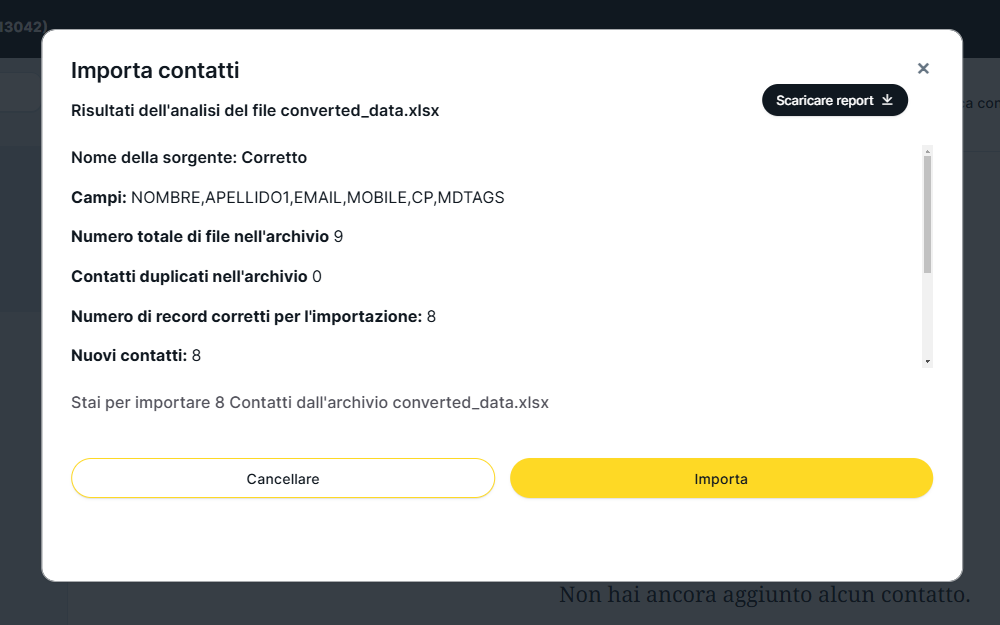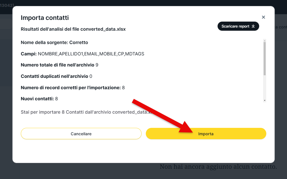 - Il numero di nuovi contatti che verranno importati con successo.