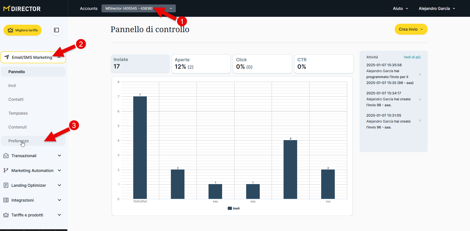 Assicurandoti di essere nella subaccount corretta, seleziona il modulo di Email Marketing nel menu laterale. Si apriranno i nomi delle diverse sezioni del modulo. Clicca sulla sezione Preferenze.