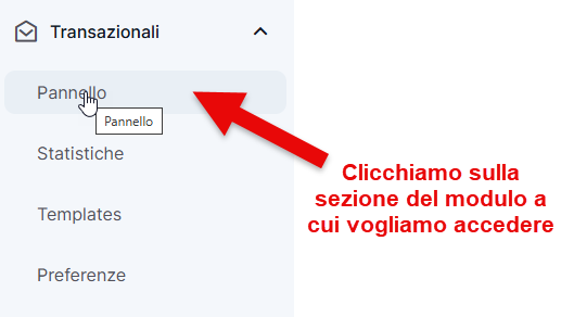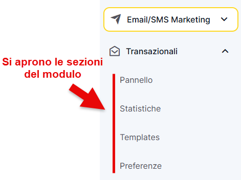 Per accedere, vai al menu laterale situato sul lato sinistro dello schermo, assicurandoti che sia espanso, e clicca sul titolo o sulla freccia alla sua destra. In questo modo si apriranno le sezioni del modulo: Pannello, Statistiche, Templates e Preferenze. Per entrare nel modulo, dovrai selezionare una di queste sezioni cliccando sul nome di quella desiderata.
