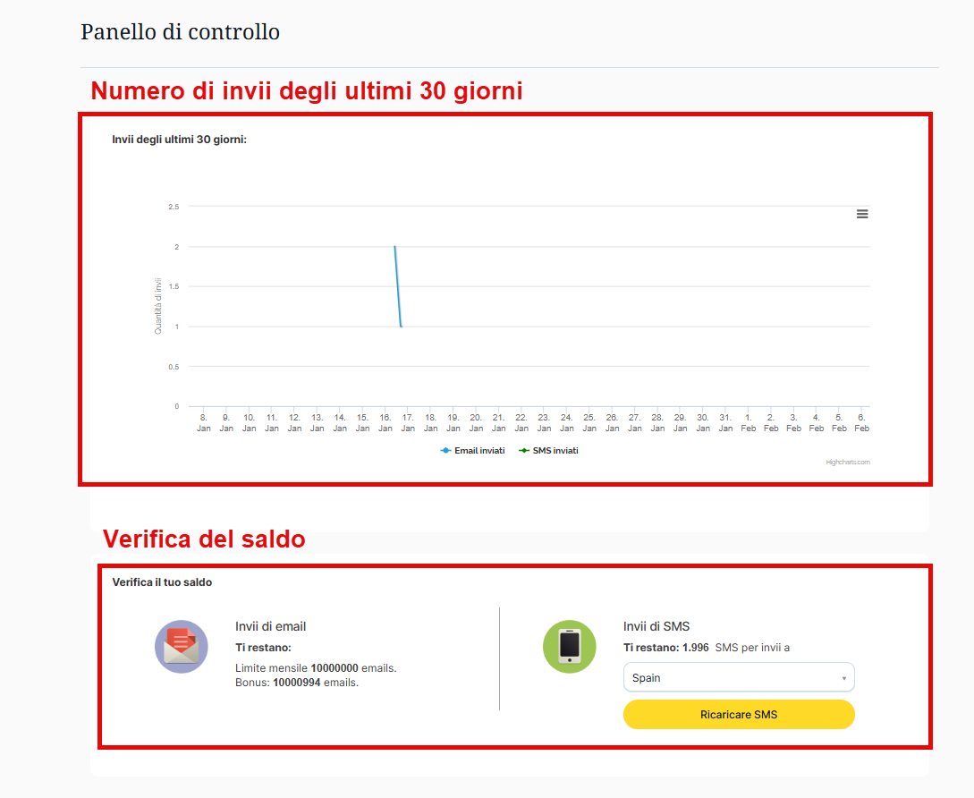 La dashboard del servizio di Email/SMS Transazionale offre una panoramica generale delle statistiche sul numero di invii—giorno per giorno—negli ultimi 30 giorni sotto forma di grafico. Da qui, puoi anche controllare il saldo rimanente degli invii di email e dei crediti SMS.