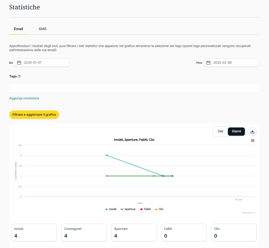 Da questa sezione, possiamo consultare i risultati degli invii e filtrare i dati mostrati per intervallo di date, mediante la selezione di tag e suddivisi per email o SMS.
