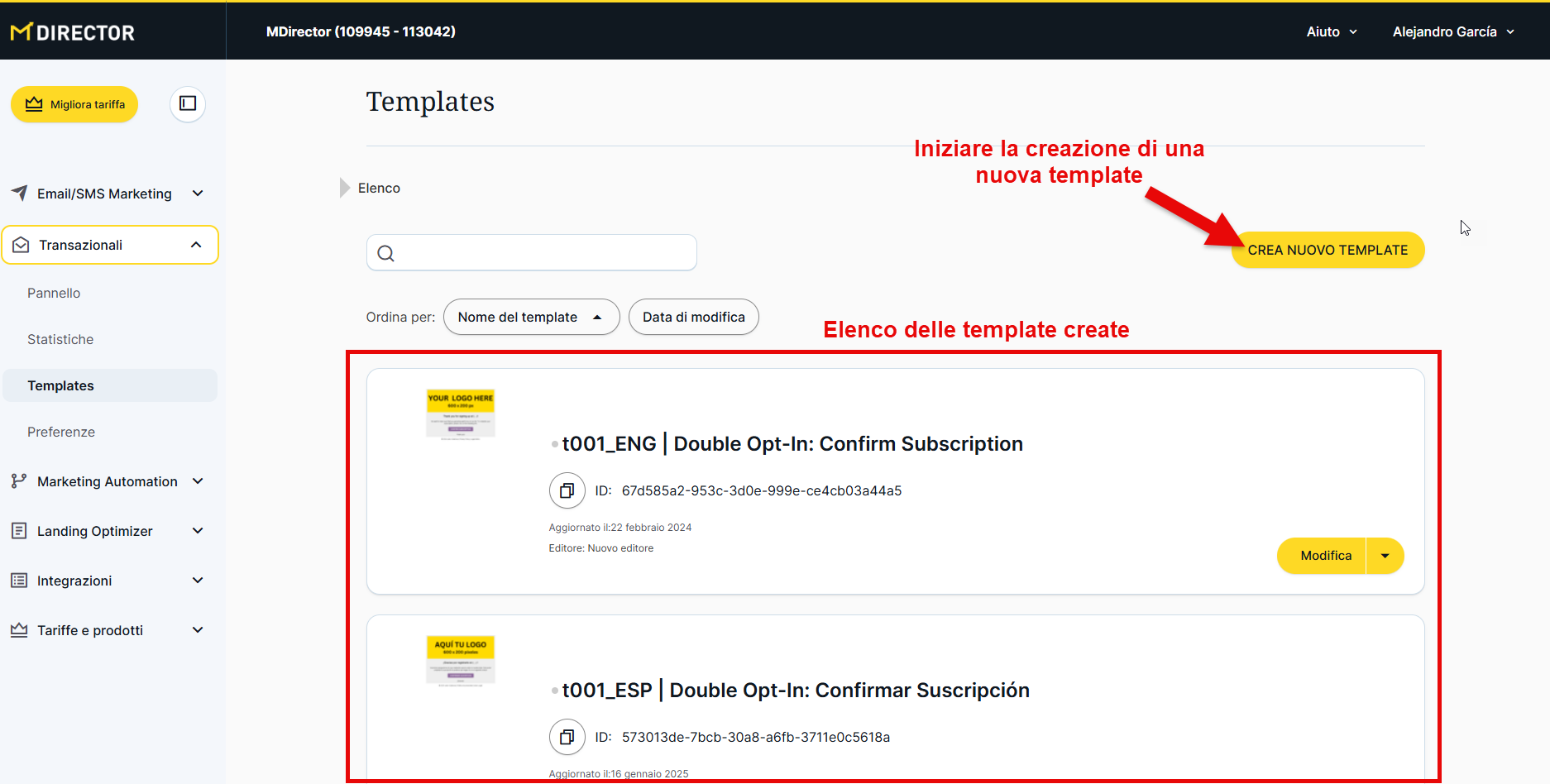 Da questa sezione, possiamo progettare le creatività che utilizzeremo specificamente per questo servizio. Qui arriviamo all'elenco, dove possiamo accedere alla modifica di una qualsiasi delle template già create o crearne una nuova tramite il pulsante "Crea nuova template".
