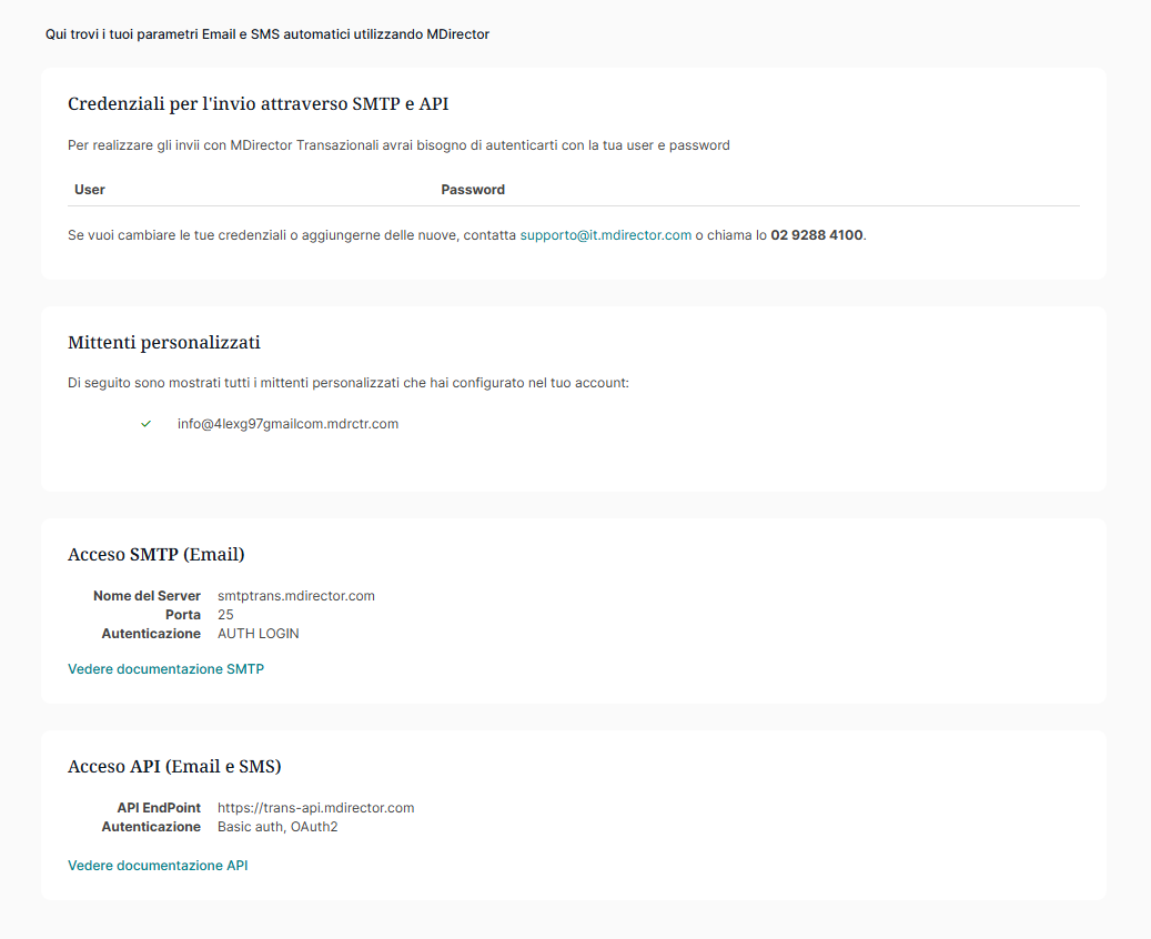 Da questa sezione possiamo consultare le credenziali per gli invii tramite SMTP e API, oltre ai mittenti personalizzati.