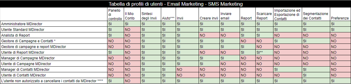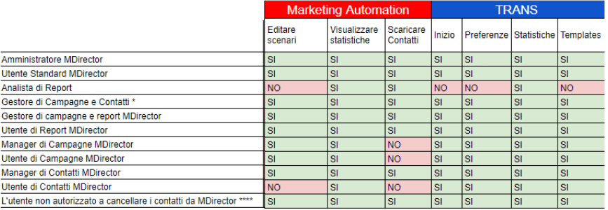 Nella tabella seguente puoi vedere i permessi di accesso associati a ciascun ruolo: