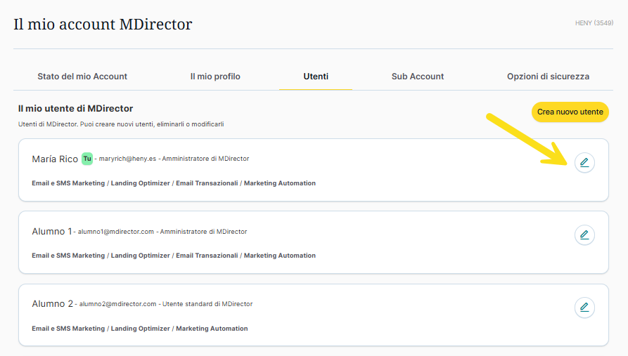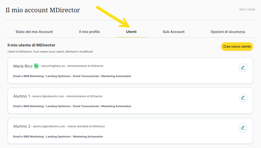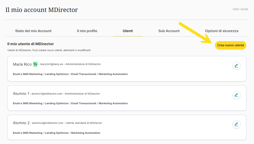 Da questa pagina è possibile vedere gli utenti di MDirector. Sarà possibile crearne di nuovi e modificarli.