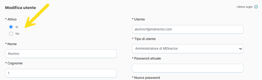 Per disattivare gli utenti, è sufficiente modificare l'utente che si desidera disattivare e selezionare l'opzione "No" tra le opzioni del menu "Attivo".