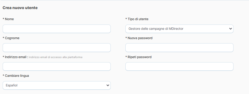 Nota: se non si riesci a creare nuovi utenti, è possibile che sia stato raggiunto il numero di utenti consentito sul proprio account. Per ulteriori informazioni, contattare il supporto MDirector all'indirizzo soporte@mdirector.com con il numero di conto in questione.