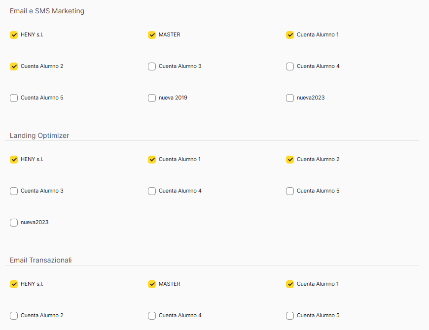 Selecciona i servizi e i subaccount ai quali questo nuovo utente ha accesso, ricordando che le azioni sono limitate in base al tipo di utente applicato nella sezione precedente. Se non hai ancora creato i tuoi subaccount, fai clic qui https://mdtr.io/VDVbW per sapere come farlo.