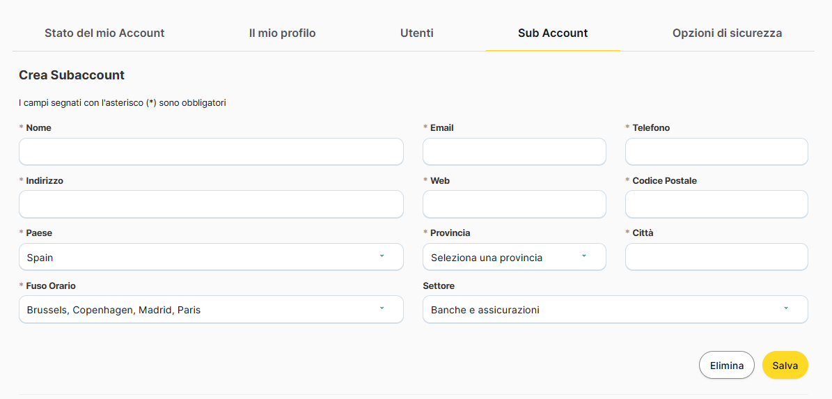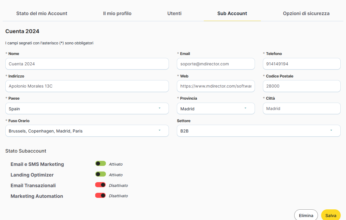 4. Si aprirà il modulo simile a quello usato per la creazione. Qui puoi modificare i dati (nome, email, telefono, indirizzo, paese, codice postale, provincia, città, fuso orario, settore) riscrivendo nei campi e selezionare il prodotto desiderato per attivare la subaccount tramite gli interruttori sotto "Stato della subaccount".